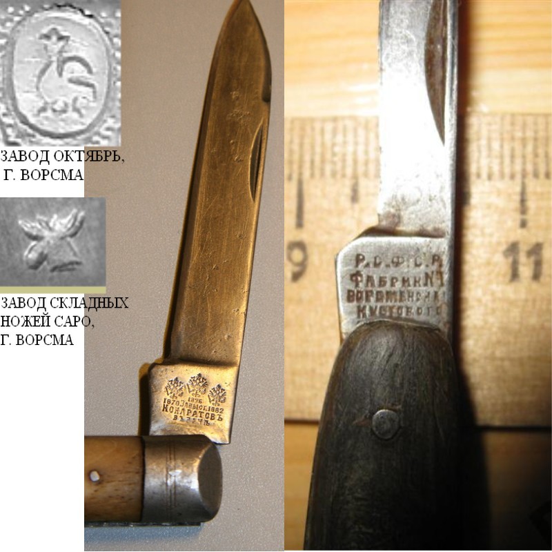 Основное производство складных ножей в СССР было сосредоточено в Горьковской области. Самый крупный изготовитель - завод "Октябрь" в Ворсме, его логотип - петушок (гусь в овале). Там же, в Ворсме, располагалось производство "Складные ножи", логотип - вписанные одна в другую заглавные буквы "С" и "Н".