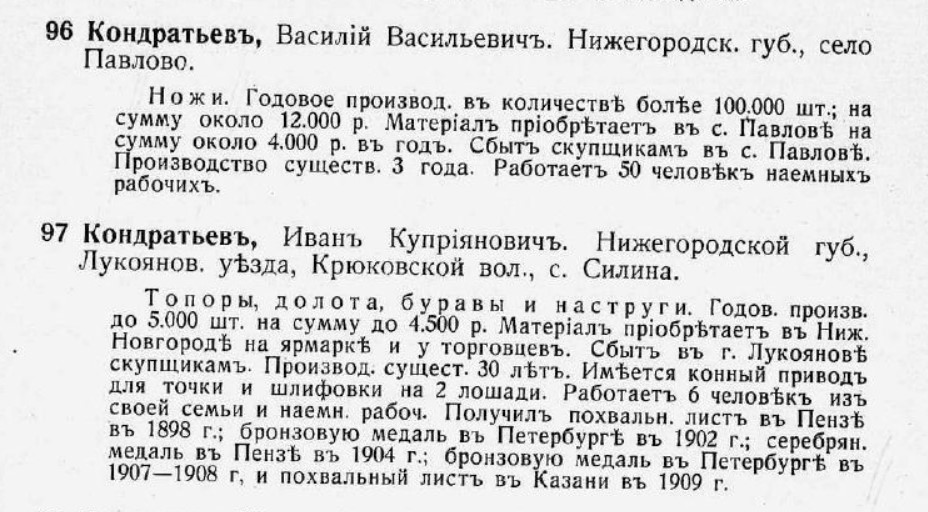 В 1830 году крепостной крестьянин Голицыных и Нарышкиных, Дмитрий Иванович Кондратов основал в селе Вача кустарное производство хлебных ножей и ходил с коробом по деревням. Его сын, Дмитрий Дмитриевич Кондратов превратил надомное производство в завод, утвердил клеймо, расширил ассортимент продукции, стал купцом второй гильдии и одним из богатейших фабрикантов губернии. В 1905 году фабрика Кондратова являлась крупнейшей в России в своей отрасли. В настоящее время завод «Труд». ![]() ![]() источник: http://muzei-nozhnic.ru
