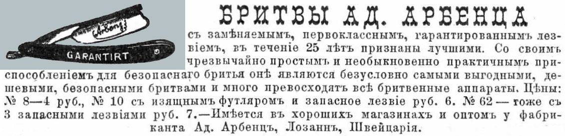 Из выше изложенного бизнес Арбенца начался незадолго до 1892г. первоначально в Англии г. Бирмингем. И был довольно успешным и видимо расширялся, была смена адреса с 107 & 108 Great Charles Street, Birmingham на 33 Ludgate Hill, Birmingham. Позже расширился территориально представительство во Франции Jugne и Doubs, после в Швейцарии Lausanne. Причем с этим действительн темный лес т.к. Jugne (населенный пункт), кроме того как то связан с патентным правом. Держатели, какие либо части бритв (сами лезвия, насадки для безопасного бритья, зажимы и пр.) защищенные уже французским панентом могли там же и изготавливаться Арбенцом (для Арбенца) в случае (переноса) расширения производства. Причем основываясь на упоминаниях в различных источниках и рекламе это происходит примерно в одно и то же время: Birmingham (Бирмингем) Англия 1888-1909-1914г. Jugne (Жунь) Doubs (Ду) Франция 1897-1910-1914г. Spoiler Show http://www.gumer.info/bibliotek_Buks/Hi ... aud/02.php" onclick="window.open(this.href);return false; United Kingdom Patent 1920-1921г. Все говорят, что мы в месте…