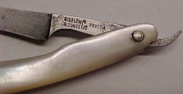 Оригинал текста продавца: A celluloid handle La Cross with box made by Schnefel Bros. U.S.A., a Mother Of Pearl handle marked Bigelow & Dowse Co. Prussia, & a slick black handle marked Robt. Klaas Prussia.