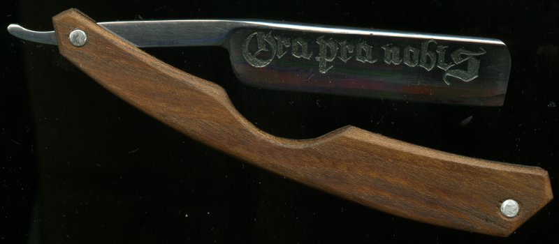 Гравировка на бритве на Латыни, "ora pra nobis" гласит " молись за нас" Re: Анти-Квариат или FAKE!Врет продавец, это не конец 19 века, а судя по тому что с эрля, со временем, стерлись все надписи это где то 15-16 век!!!!!