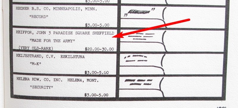 Производитель JOHN HEIFFOR, 3 PARADISE SQUARE SHEFFIELD, модель MADE FOR THE ARMY. Упоминание о ней в одной книге с