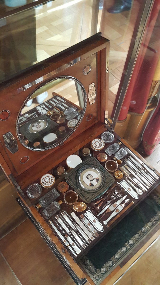 Недавно побывал во Франции. Помимо других интересных мест посетил дворец Фонтенбло (Château de Fontainebleau). И там, в музейной экспозиции обратил внимание на интересный экспонат - походный несессер Наполеона, а рядом с ним еще и что-то типа походного умывальника с зеркалом.