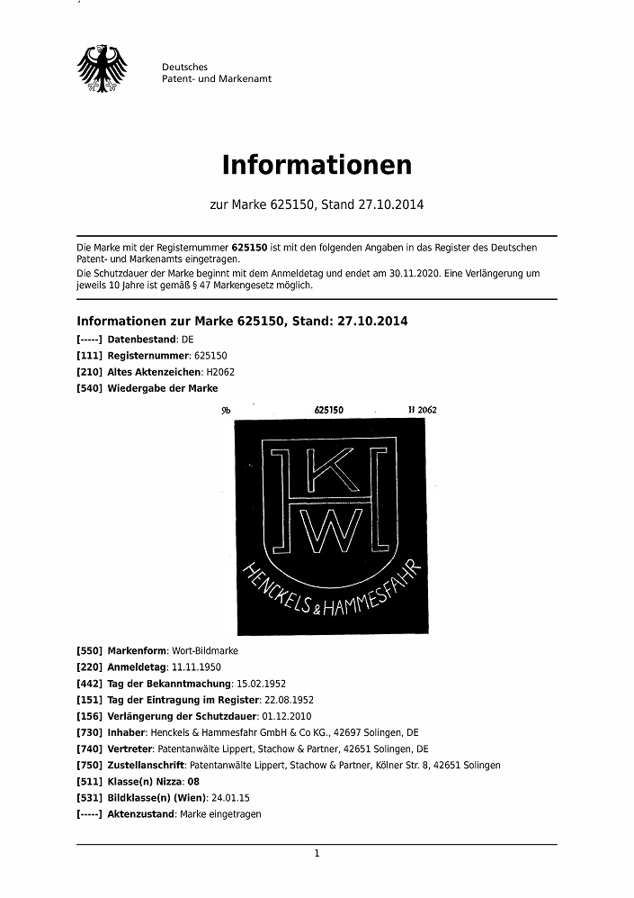 Двести пятьдесят лет Золинген столовых приборов: Gottlieb Hammesfahr, Золинген-Foche; 1684-1934; [Festschrift] / автор Франц Hendrichs (Zweihundertfünfzig Jahre Solinger Messerschmiede : Gottlieb Hammesfahr, Solingen-Foche ; 1684-1934 ; [Festschrift] / Franz Hendrichs) https://portal.dnb.de/opac.htm?method=s ... D580908011" onclick="window.open(this.href);return false; кто будет мимо проходить - отсканируйте, пожалуйста))), там все ответы.... по ходу это другой Hammesfahr. Торговый знак зарегистрирован в 17/11/1952 года. в 2011 года действие патента продлено до 2020 года. Так, что живы, курилки)) класс патента: столовые приборы, ручные инструменты, оборудование по уходу за кожей и ногтями. кол. человек: 8-19 под катом ссылка и копия с сайта регистрации торговых марок Германии Spoiler Show