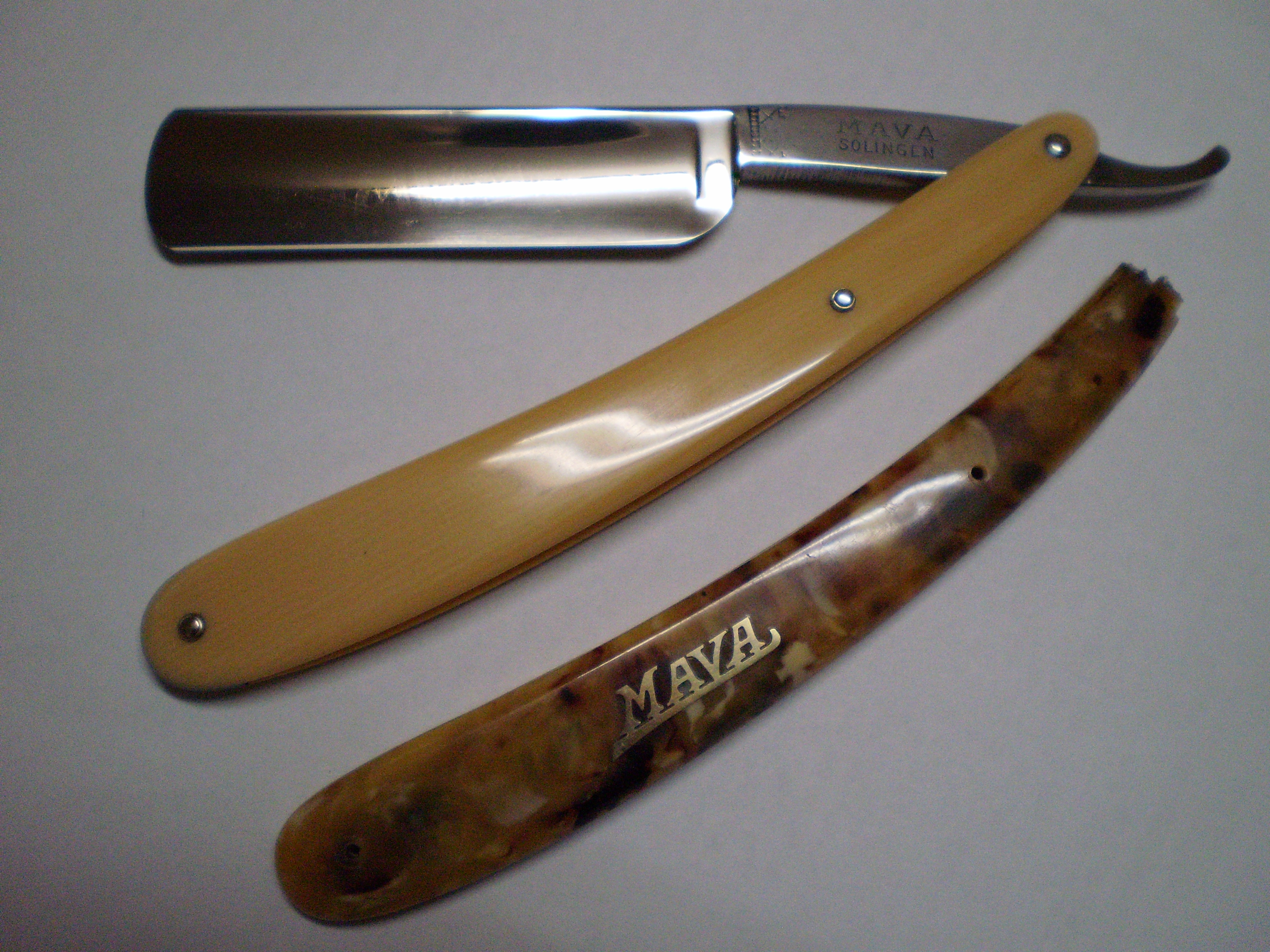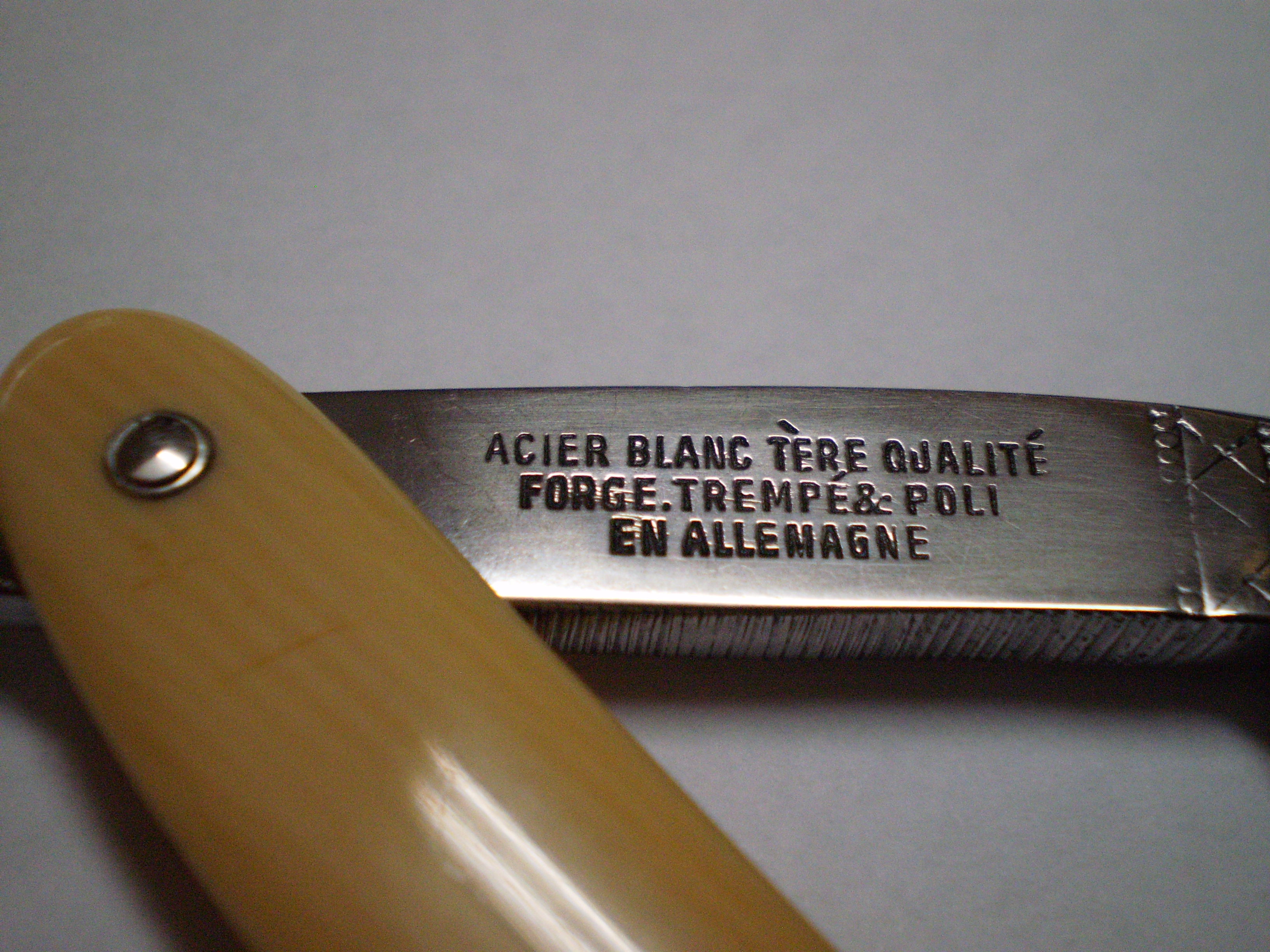 Она была очень ржавой и со сломанной оправой. Точное копие ее ручки сделал из другой, погибшей немки. Вот фото. Внизу, оригинальная ручка. Может быть, надо изменить название темы, потому что возможно будут еще золингеновских бритв, сделанных на экспорт для Франции.