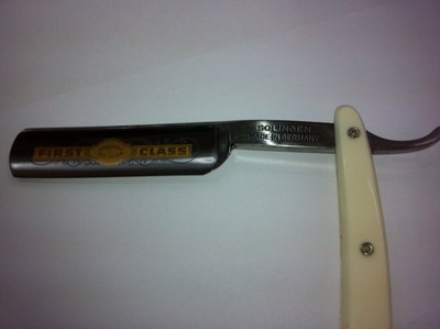 1. Странная коробка со странными надписями. 2. На самой бритве нет ничего, кроме "золинген мейд ин германи". Любая фирма в германии нанесла бы своё название на эрл. 3. Заверения на полотне "оригинальный золинген", "первый класс" не внушают доверия. Лично я бы не стал связываться с подобным.