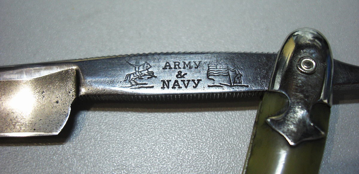 Как минимум три фабрики выпускали бритвы с брэндом Army and Navy. Это С. Friedrich Ern Ern-Rasiermesserfabrik, Solingen-Wald, Razor Imperial USA New YorK City (про неё можно написать отдельно, думаю они заказывали у С. Friedrich Ern) и Lakeside Cutlery Co (справа и слева от надписи Army and Navy пехотинец и моряк с винтовкой). Про S&D пока ничего нет... Но где-то мне это попадалось на глаза, не могу вспомнить где, всё перерыл... Ремонт опасных бритв, звонить с 11-00 до 23-00, +79267729357, (viber, whats app, telegram, VK), спросить Олега.