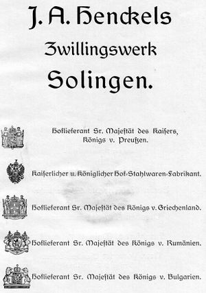 Торговое имя Henckels было зарегистрировано Торговой палатой 5 декабря 1882 года. Фирма стала поставщиком Прусской Королевской и Австрийской Императорской семей, и открыла выставочный зал в Берлине на Jagerstrasse 50, который позже переместился во впечатляющие владения на Leipzigersrtasse 117-118. К 1900 году фирма принадлежала Fritz W Beckmann (Фритц В Бекманн) и Alfred Wolters (Альфред Вольтерс). В 1883 году в Нью-Йорке открылся американский выставочный зал, а импорт ножей Henckels был возложен на фирму Graef & Schmidt (Грэф и Шмидт) [которая в 1943 году была куплена фирмой Revlon (Ревлон) из США]. Также, в 1913 - 1914 годах Henkels производила первые ножи Ellery Hunter (Эллери Хантер) для фирмы из Сан-Франциско Ellery Hunter Co.