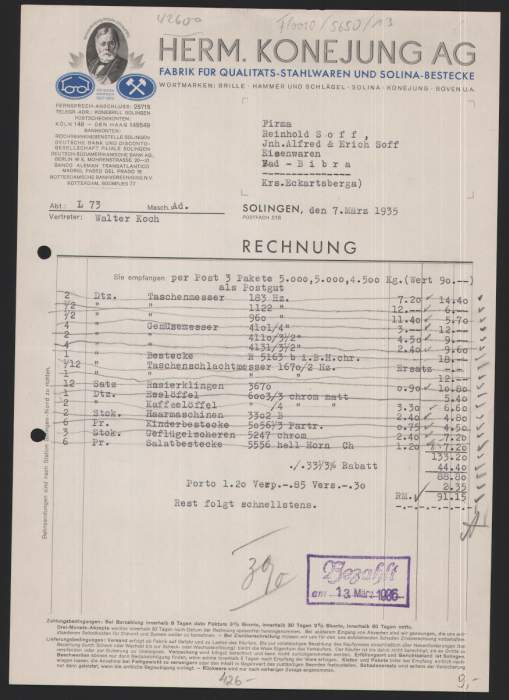 В 1939 году фабрика находилась на Cronenbergerstrasse, 60. В 1986 году на Schlagbaumerstrasse, 67 и в 1998 году на Kleine Kamperstrasse, 11a. Торговые марки: Solina (пат.№64644 в 1903 году), Arco, Boven, Hammer&Schlägel (hammer&mallet), Herko, Hermko, Hermako, Hannovera, Ora, Stahlberg, Stahlmann, Towerstar, Wetterhahn (weather cock). Продолжение следует...