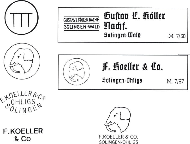 Брэнды: Berlini, Best Marke Schaukelpferd ("best mark of rocking horse" детали регистрации неизвестны), Bora Boedoer(1909, no.115903, класс 9b, 17 и 23), Diamond (1912, na 158667, класс 9b), Die Feder ist scharfer als das Schwert (Ручка острее меча) ("The pen is sharper than the sword", 1911, no. 148639, класс 42), Elfenbein-Marke (1916, nо. 210212, класс 5, 9b and 23), Khandia (1913, na 184174. класс 41), Kismet (1910 and 1921, no. 133487 and 265893, класс 9b), Magna (1898, no. 31487 in класс 9b, and 1911, no. 147795 класс 42), Magna Brand (1901/2 класс 9b, 4 и 31), MagnaTop (17th May 1996, no. 39537574, класс 8, закрыта в октябре 2005), Magna-Wexl (1905, no. 80552, классы 9b и 19), Manda (1903, no. 64301, класс 9b), Mena (1907, no. 98957, классы 9b, 17, 22 и 23), Nadir (1910, no. 133876. класс 9b), Oil the Joints (1901/2, no. 52010, классы 9b и 42), Okay (1903, no. 62709, классы 9b и 23), Ping Pong ("P" общая для обеих линий), 1902, no. 52484, класс 9b), Prince Khandia (1909.no. 116020, классы 9b, 17,23 и 24), Schirajee der Grosse (1910, no. 126723, класс 42), Scout (1910, no. 133001, класс 9b), Seeadler (возможно 1923, no. 308882), Stasharp (зарегестрирована после 1929), Summore (1913, no. 171958, класс 42), Die Emperor of India (1911, no. 140614, класс 42), Tolstoy (зарегистрирована в 1900 в кириллице Толстой, no. 44276, классы 9b and 23), Tsarya (зарегистрирована в 1899 в кириллице Царя, обычно отделяя два слова русского языка от Trade Mark (возможно Торговая Марка прим. Олег Бритва), no. 37929, классы 9b and 23), Velvet (1908, no. 104666, классы 9b, 17 and 21), Westend Kompactum (1903, no. 57931, класс 9b), Wexl {1899, no. 39032, классы 9b and 23), and Zarja (смотри Tsarya). F Koeller также был связан я с ELEFANT, Elefantenkopf (“голова слона”) и Elephant, считается, что всё это иллюстративные описания основного знака. Товарные знаки: шестиколесный паровоз(зарегистрирована в 1894, no. 1310, класс 9b); этикетка с парой рук, смазывающих перочинный нож с открытым лезвием, OH THE JOINTS, Хороший нож стоит небольшого ухода (1902, no. 52010, класс 9b и 42); тройной T с общей перекладиной ( 1903, no. 61397, класс 9b); a Wright Brothers-type biplane (биплан братьев Райт)(1909, no. 117716, классы 9b and 17); деревня на вершине (?) под BORA BOEDOER (1909, no. 115903, классы 9b, 9f and 23); орлиный коготь, сжимающий ромб, образованный на каждом конце горизонтальной планки с загнутыми вверх концами(1912, no. 158667, класс 9b); голова слона над ELFENBEIN MARKE (марка слоновая кость 11916, no. 210212, классы 5,9b and 23); крытая повозка, запряженная четырьмя волами (1923, no. 308882, класс 9b); перо и меч в сальтире, в овале; и декоративная рукоять ножа с надписью на иврите (1899, no. 40575, класс 42). RZM номера: M7/97. Основана в 1855 г. и зарегистрирована в коммерческих органах 23 апреля 1906. F Koeller производила столовые приборы, настольные наборы и бритвенные лезвия, отличающиеся большим разнообразием торговых марок. Штыки: S. 84/98 выпускались в 1915-17 и s. 98/05 в 1917-18 (GB/1/8о); некоторые из заготовок лезвия S. 98/05, по-видимому, были изготовлены в Билефельде компаниями Dürkopp-Werke и Anker-Werke (qqv.). Комбинированные штыки траншейных ножей с штампованной листовой рукоятью производились и в годы Первой мировой войны [EB2, GB/111/33, DK/2]. Кинжалы: Несколько кинжалов SA раннего типа, изготовленных или завершенных во времена Третьего рейха, будут отмечены клеймом в виде головы слона над названием компании и местонахождением, но более поздние образцы, возможно, не имели ничего, кроме номера RZM. Торговля была успешно восстановлена после окончания Второй мировой войны, торговля все еще продолжалась в 1986 году как F. Koeller & Co., Kismet-Bürostahlwaren на Oberhaanerstrasse 2, но окончательно закрылась в начале 2000-х.