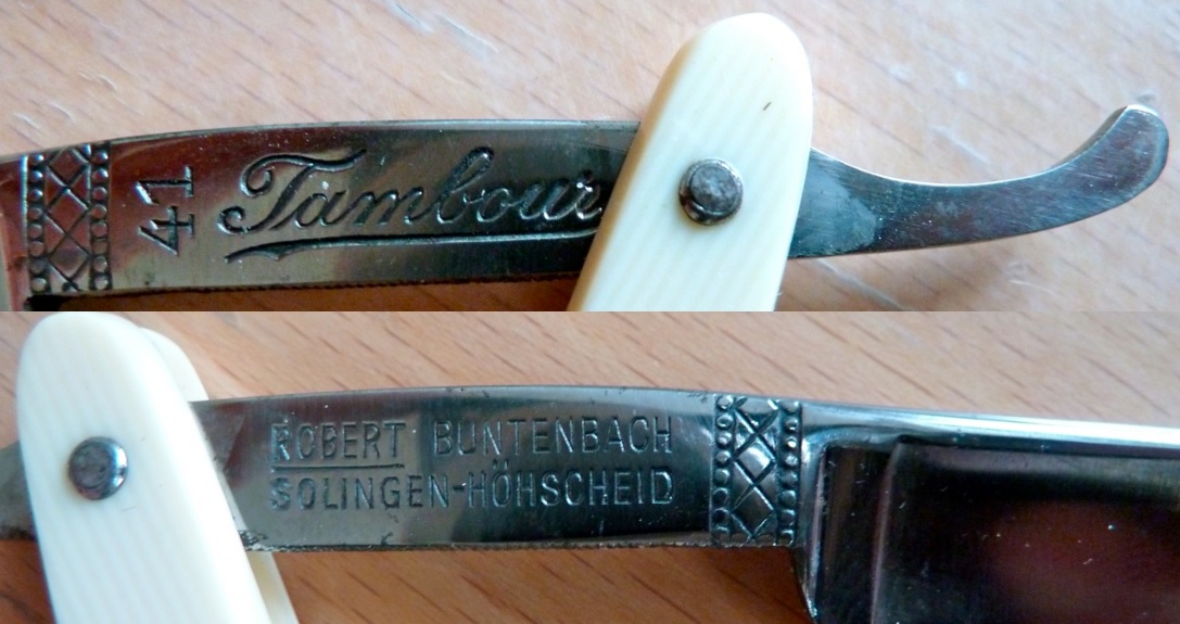 Robert Buntenbach, Robuso, Solingen in 1922 and 1932, Neuenhoferstrasse 75 in 1983. Brand names: 'Bretzel', 'Robuso', 'Stoppelmäher', 'Tambour'. Open-blade razor maker.