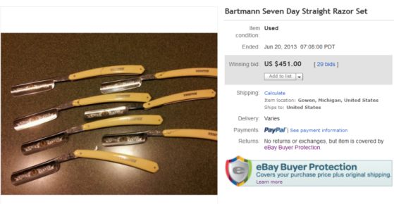 Re: Kronenberg SolingenНаборы в таком состоянии и от неизвестного производителя не могут столько стоить. В наборах бывают обычно 7 бритв(неделька), а тут целых 10 штук, видимо это не набор а подарочная упаковка. Если нет клейма производителя, то ценность не велика, если все целые бритвы, без потерь, то на Ебее может за 400 $ продадутся, а вот за 1000 $ , ой, я вас умоляю. Вот вам пример: http://www.ebay.com/itm/DOVO-VINTAGE-ST ... 9231919%26" onclick="window.open(this.href);return false; И ещё: Re: Kronenberg SolingenЖелание продать конечно есть, но не такое сильное (все мы немного люди алчные). В первую очередь хочется понять откуда данное чудо появилось, поскольку я знаю, что мой прадед занимался реставрацией антиквариата в 30 х годах, и имел внушительную коллекцию, которая, к сожалению, была либо разворована, либо конфискована в не лёгкие годы войны.