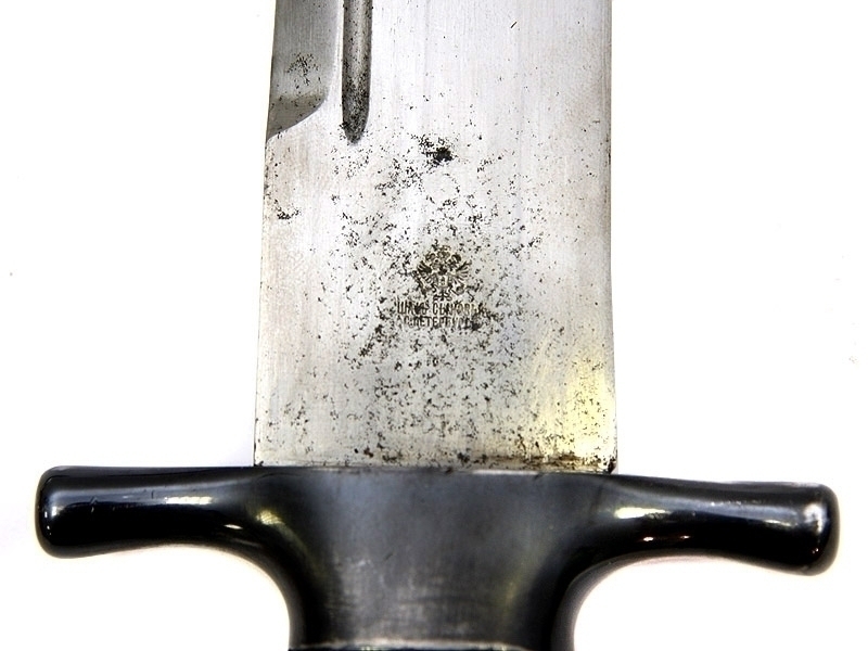 - Медвежий массивный охотничий нож в деревянных ножнах, обтянутых черной кожей. Клинок с одним долом, маркирован клеймом "Шафъ и Сыновья, С. Петербург", с лицевой стороны травлением нанесен фамильный вензель владельца и 1891 год. Рукоять из черного дерева с рифленой поверхностью. Прибор рукояти и ножен стальной, покрыт воронением. Воронененое покрытие прибора, рукояти и ножен восстановлено. Конец XIX века.