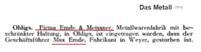 В 50х отметились экспортом бритв и ножей в США В 1937 году ей принадлежали торговые марки: ALVIS, BROSEM, CHARLIOR, KIEBITZ, KOBAR, KUKRI, RINGDOWE. . после войны, торговая марка KOBAR перешла к Friedrich EMDE Spoiler Show Friedrich EMDE год основания не известен, в 1937 году владели торговыми марками: ESPOSOS, PADRES после войны добавились DEBUT, KOBAR Spoiler Show Spoiler Show Для полноты картины: Был еще один EMDE, Max Emde и фирма Emde & Meissner. В 1912 году фирма увеличила свой капитал до 200000 марок, а в 1914 году фабрикант Max Emde умирает Spoiler Show