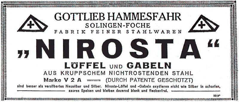 Интересная ссылка. Человек занимается восстановлением столовых приборов. Мужчина получил на Gottlieb Hammesfahr & Co. AG, Nirosta-Werk эту редкую профессию. Там есть контакты, можно просто позвонить и спросить может он чего знает о фабрике. Это может сделать , к примеру, Bea Jee. Можно письмо написать. Ремонт опасных бритв, звонить с 11-00 до 23-00, +79267729357, (viber, whats app, telegram, VK), спросить Олега.