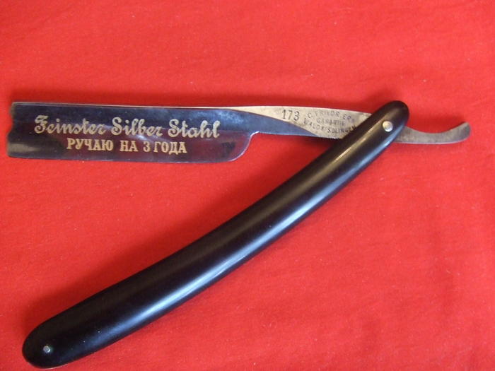 был недавно в славном городе Сергиевом Посаде и купил у какого-то дедушки за 50 р. бритву. На ручке надпись: C.Friedr.Ern. на клинке надпись P r i m u s, возле пятки орел у которого в коктях змея и под ним надпись "wald-germany' и рядом номер 2668, на оборотной стороне надпись ERN. дома я ее немного поточил... думал будет не очень, но теперь даже "гнома" отложил на полку... (но ве равно енто моя САМАЯ любимая бритва)))))). При бритье она издает довольно приятний громкий шуршащий звук...Но до меня какой-то вандал точил ее походу об кирпич (имеются небольшие риски на обухе и самом полотне)...и имеется люфт в шарнире м/д клинком и рукоядкой... подскажите пожалуйста енто излечимо или нет????