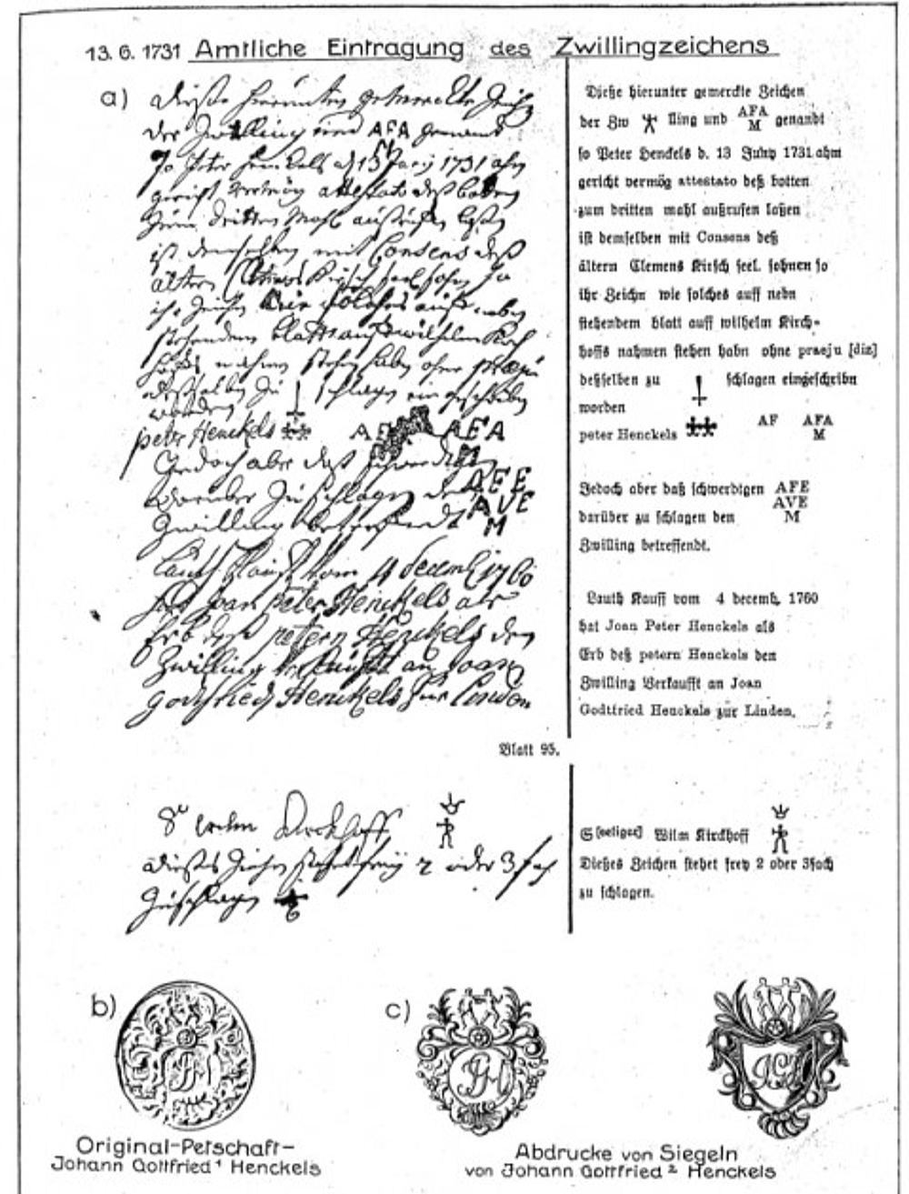 К 1760 г. оба этих клейма были во владении Joan Peter Henckels и он разрешил ими пользоваться Joan Gottfried Henckels. Для этого собственно и составляли документ. Благодаря этому документу, мы можем представить, как выглядели первоначальные клейма Zwilling. Клинки от родоначальников Henckels, к сожалению, до нас не дошли.
