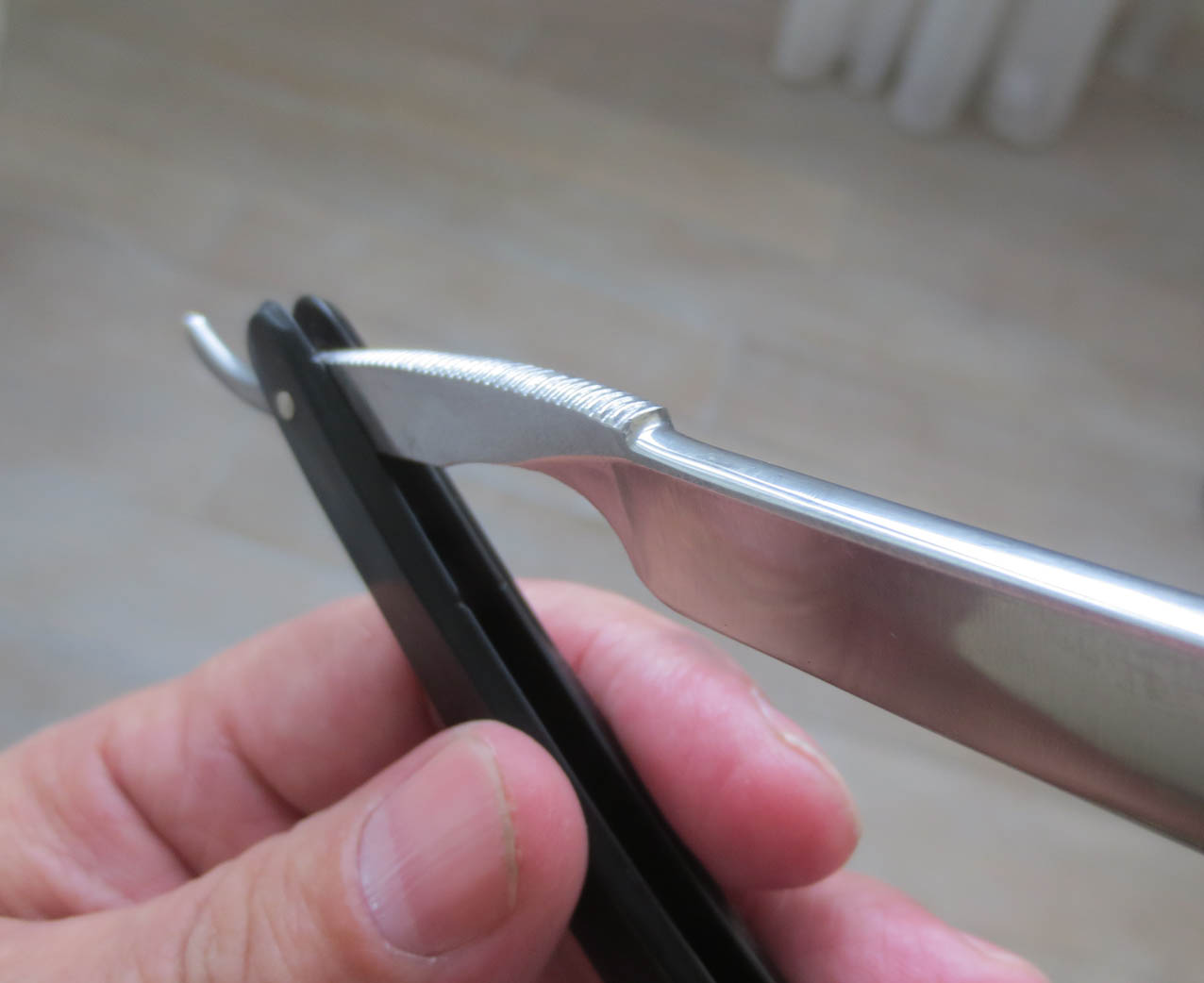 У некоторых моделей бритв эрль и хвостик закрыты целиковым куском слоновой кости. Большинство других производителей бритв обычно приделывали пластину слоновой кости к каждой стороне эрля и хвостовика. При взгляде на бритву сверху были видны щели между слоями слоновой кости и металла. Шестьдесят лет спустя современные коллекционеры замечают в этих щелях уродливые пятна ржавчины. В варианте Хенкельс видно, что в целиковом куске слоновой кости пропилен желоб, в который точно входят эрль и хвостовик. Обычно металлическая часть заканчивается сразу за заклёпкой, хвостик же остаётся почти полностью из слоновой кости. При взгляде сверху и сбоку можно увидеть только слоновую кость. «Сэндвич» из металла, облачённого в слоновую кость можно обнаружить только при взгляде снизу.