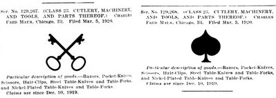 и правда, с 1919 года "пиковая масть" и "скрещенные ключи" принадлежали фирме Charles Fred Maus, Chicago, бритвы, складные ножи, машинки для стрижки, ножницы, столовые ножи и вилки.