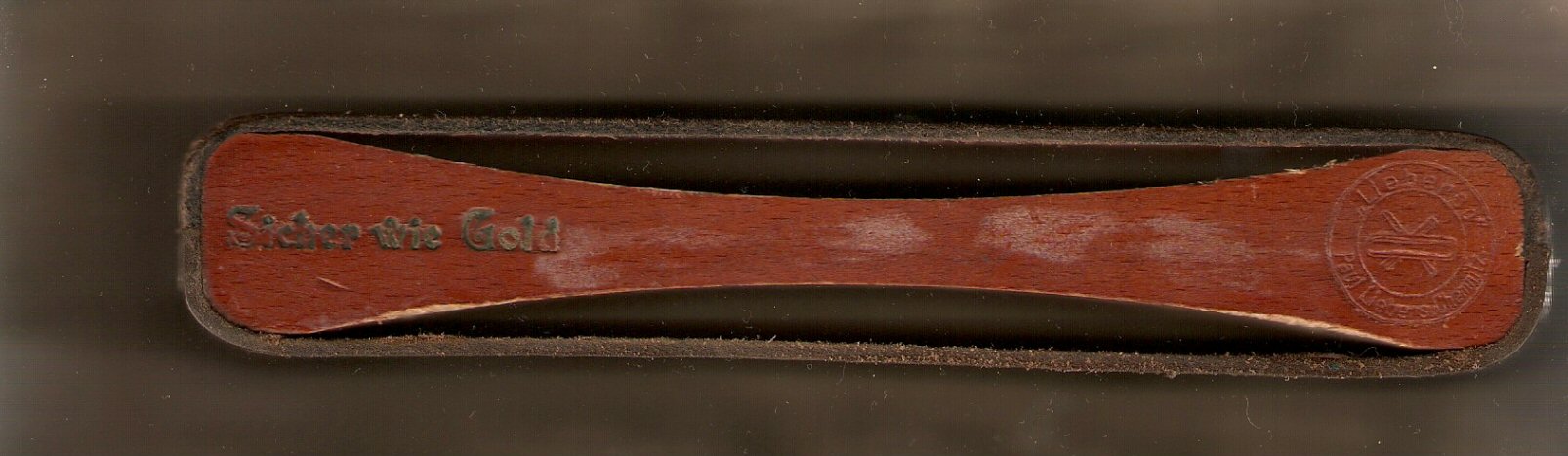 На каждой стороне деревянного корпуса надпись готическими буквами Sicher wie Gold - надежный как золото, напротив эмблема "Lieberso" Paul Liebers, Chemnitz. Обе стороны кожаного ремня - черного цвета. Но одна сторона помечена тиснением "1", другая "2". Внешне они мало чем отличаются. Возможно натяжением, так как сторона "2" более плоская. "1" имеет слегка выпуклую геометрию.