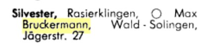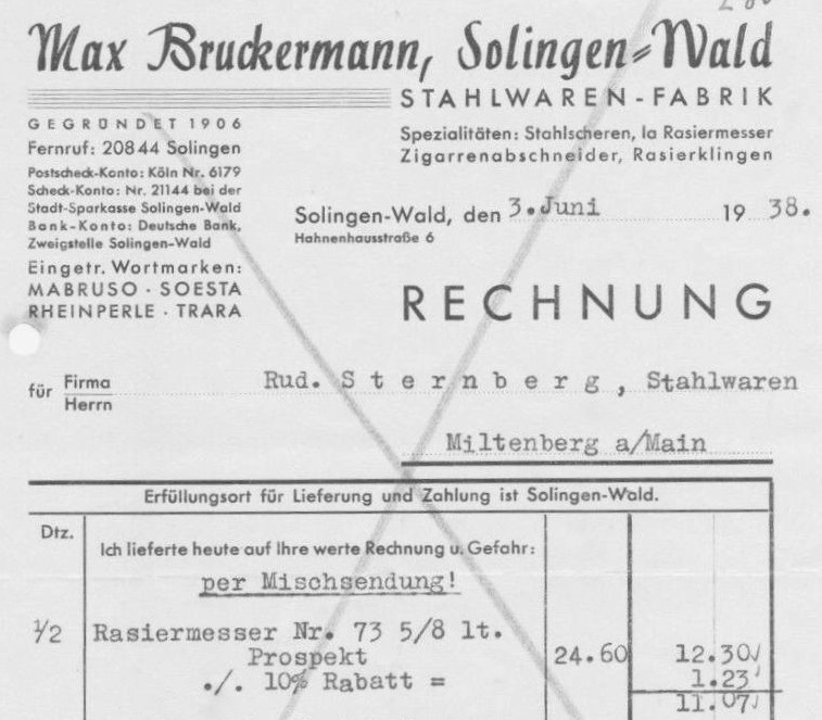 теперь есть: счет за 1938 год. торговые марки: MABRUSO, SOESTA, RHEINPERLE, TRARA В справочнике Deutsches Markenartikel-Adressbuch: 1932 - 1933 есть еще одна торговая марка Silvester, лезвия для бритья После войны Bruckermann восстановил производство. из Туринского экономического журнала, 1950г Spoiler Show