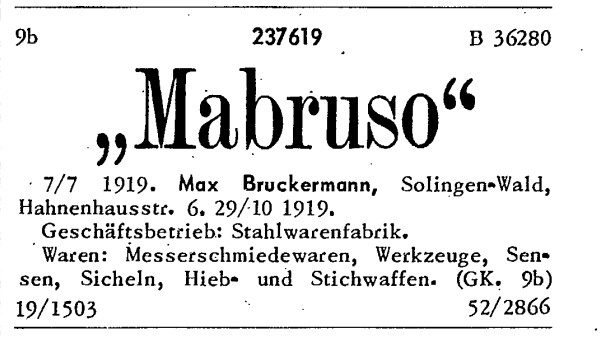 Max Bruckermann, Mabruso. Solingen Wald.В теме "Все фирмы и ТМ из Золингена и оканчивающиеся на "So"..." есть информация, что MABRUSO это Max Bruckermann, но документарного подтверждения не было.