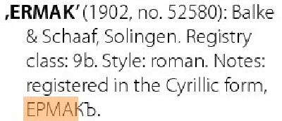Подтверждение о марке "Ермакъ" в каталоге производителей: "German Cutlers, toolmakers and metalsmiths. All illustrated register of trademarks & brand names 1871-1945" John Walter."