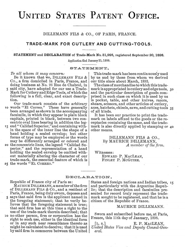 Заявление и декларация товарный знак за № 31,995, зарегистрирована 20 сентября 1898 года.