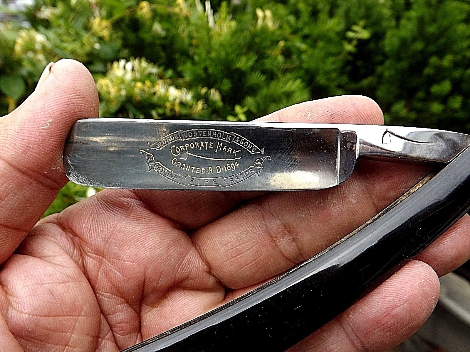 Вот неглядючи в попыхах схватил такого Востенхольма. Простенький, страшненький, ручку из рога повело и перекосило и скорее всего она не родная - внутри на обоих половинках надпись A.Linder то ли выжжена, то ли вдавлена. Ну и форма бритвы мне кажется немного подкорректирована. Ширина полотна 15 мм, длина 73 мм.