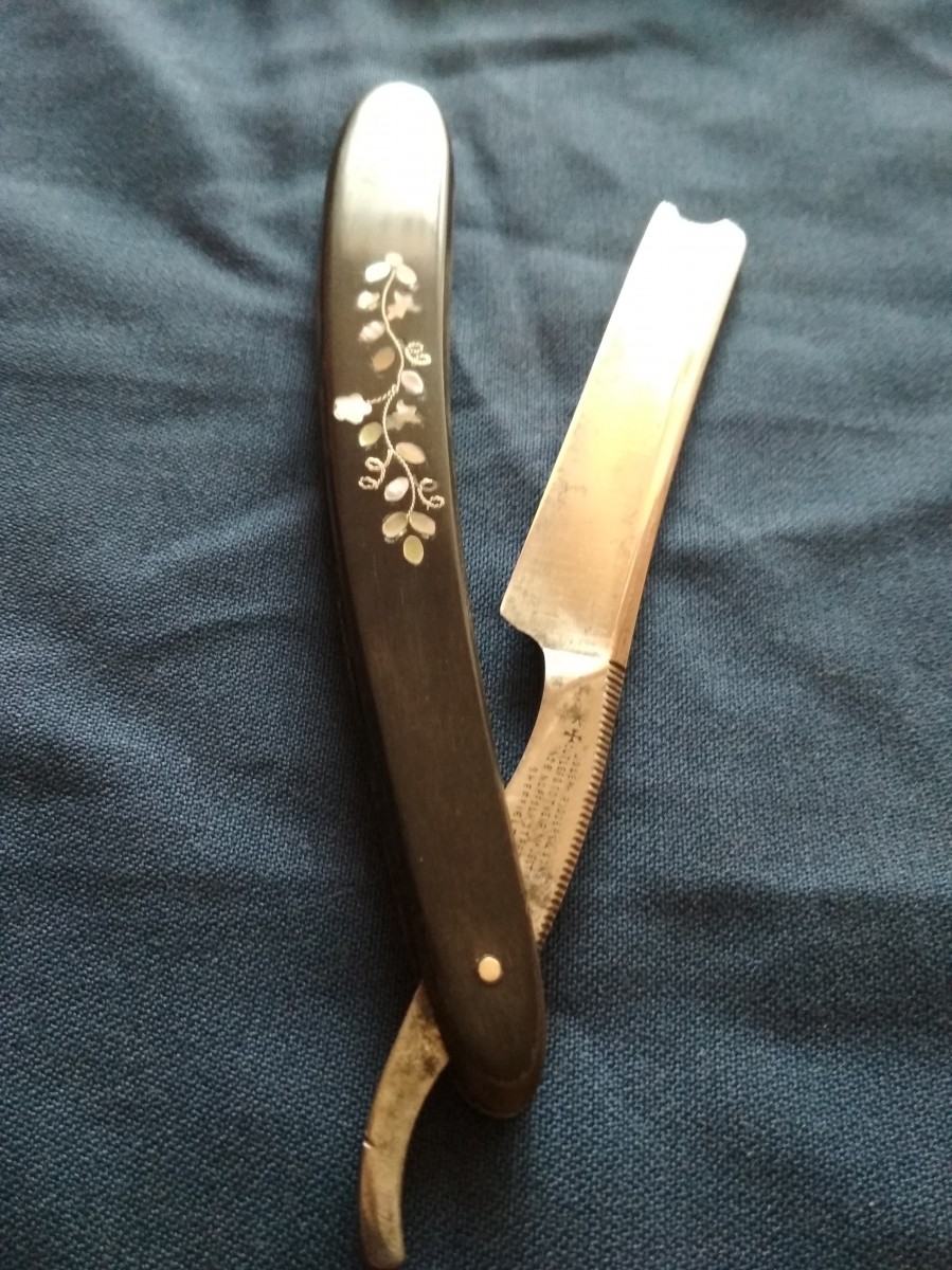 Интересно, что сталь, из которой выполнена бритва, очень слабо поддается коррозии или появлению патины. Когда получил бритву было видно, что ей пользовались, но полотно за 150 лет осталось практически без следов времени. Заметил, что те же батчеры того же периода покрываются сильной пaтиной и точечными очагами коррозии. Мой батчер за несколько месяцев использования потемнел в верхней части, где пальцы во время бритья держат бритву (хотя всегда очень тщательно удаляю влагу с бритвы после бритья).