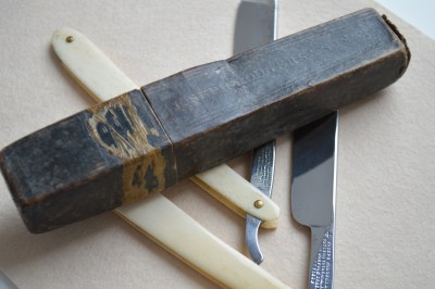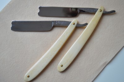 сладкая парочка... одна до 1890 года, вторая после. родное зеркало, есть немного следы от небрежного хранения, но без надобности что-то драть наждаками, приятные такие и свежие экземплярчики. и футляр на два Роджерса, но, наверняка, с другой модельки. эти бритвы маленькие для него :)