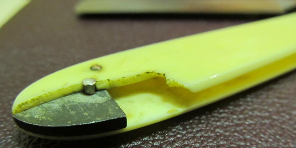 И ещё вопрос: примерно когда произведена бритва. Ширина 5/8. Ручка похожа на кость. Клинышек из металла (наверное олово, где-то читал такое).