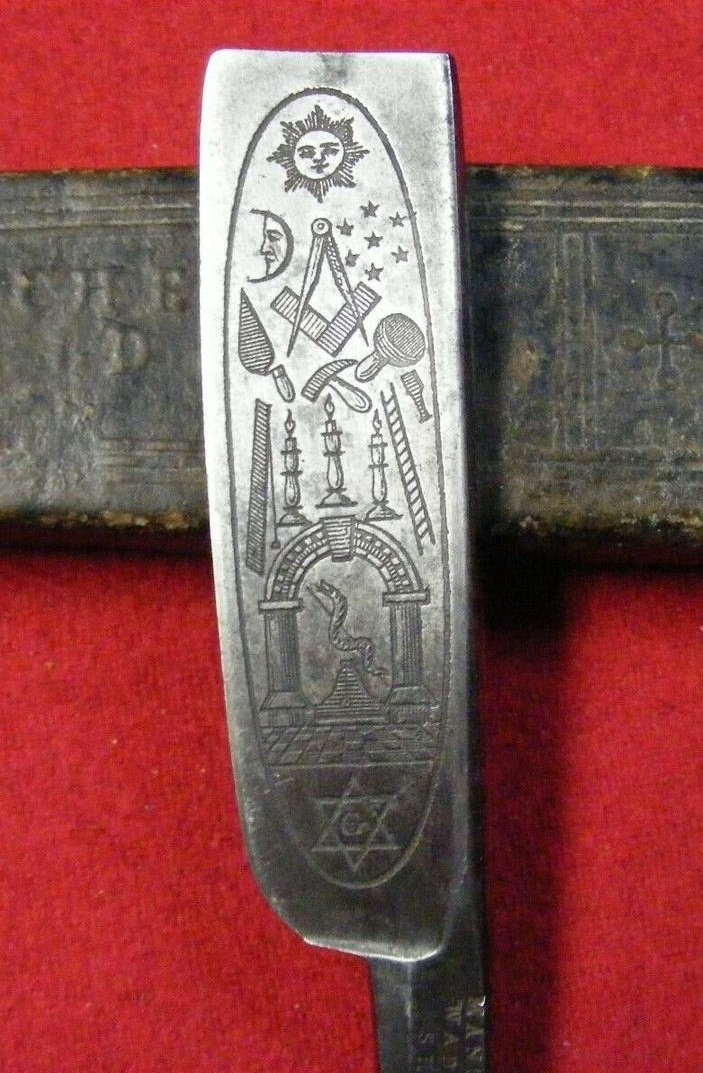 Нил Миллер (SRP) пишет: Многие символы имеют двойное значение — одно для непосвященных, другое для знающих. Вверху находятся солнце, луна и звезды, представляющие святое воинство небес и составляющие троицу. Солнце и луна (одна для освещения дня, другая для освещения ночи) являются частью мифа о сотворении мира, а глаз (если он присутствует) представляет собой всевидящее око Бога. «Мистическая» или «богословская» лестница — это та, которую видел Иаков во сне, эзотерическое значение — мост между небом и землей, более прозаическое — лестница между полом масонской ложи и крышей, представляющая продвижение. В ранних примерах всего семь шагов. Затем есть три столпа — мудрость/сила/красота — основа Ложи. Тройка представляет собой не только идеал, но и троицу, а также может относиться к реальным храмам, каменная крыша которых поддерживается тремя колоннами. Далее идут две колонны храма Соломона — Иоаким и Вооз, означающие двойственность, мужскую и женскую, над которыми находится арка (небесный свод), часто показывающая всевидящее око, с краеугольным камнем (силой) храма, находящимся в его вершина - Бог. Иногда изображается и пол храма — клетчатый, белый/черный — еще одна двойственность света/тени, удовольствия/боль/, радости/печали. жизнь смерть. Между столбиками на вашей бритве у вас есть звезда Давида. Помимо своего очевидного значения, его можно рассматривать как два треугольника, один из которых направлен вверх к небу, а другой — к земле — макрокосм/микрокосм, «ut supra, ut infra» — как наверху, так и внизу — оккультное значение герметического значения, означающее, что действия одного влияют на действия другого. Звезда часто имеет в центре букву «G», якобы обозначающую «Бог» Внизу находятся циркуль и угольник — древние инструменты каменщика (стальной угольник использовался до относительной поры в строительной торговле, вместе они говорят каменщику быть честным и открытым со всеми людьми и проявлять умеренность во всем. Другое значение состоит в том, что квадрат измеряет плоские вещи, а циркуль окружает предметы - землю и небо, а также женское (квадрат) и мужское (циркули) - еще один символ зарождения. С одной стороны — отвес, означающий, что каменщик должен жить честно — Амос видел Господа с отвесом в руке. С другой стороны находится коса - она перерезает нить жизни, чтобы отправить человека в вечность, и часто сопровождается песочными часами, символом быстротечности жизни - пара сначала имеет мрачное значение, но на самом деле означает воскресение. Две другие формы немного загадочны - закругленная может быть головкой молотка (контроль, дисциплина), но я не уверен насчет другой: может быть, дно песочных часов? Мастерок, угол и циркуль - это инструменты мастера-каменщика 3-й степени. Чтобы стать масоном-мастером, нужно пройти долгий и утомительный процесс. существует три степени, и все посвящения передаются от наставника к мастеру до тех пор, пока начинающий каменщик не сможет пройти церемонию по собственному желанию. Льюис — это рабочий инструмент, масонский символ или молодой человек, усыновленный ложей. Льюис - инструмент в оперативной кладке. Это скоба, которая вставляется в подготовленную для этой цели полость в любом большом камне, чтобы прикрепить шкив и крюк, с помощью которых камень можно удобно поднять на любую высоту и уложить в н