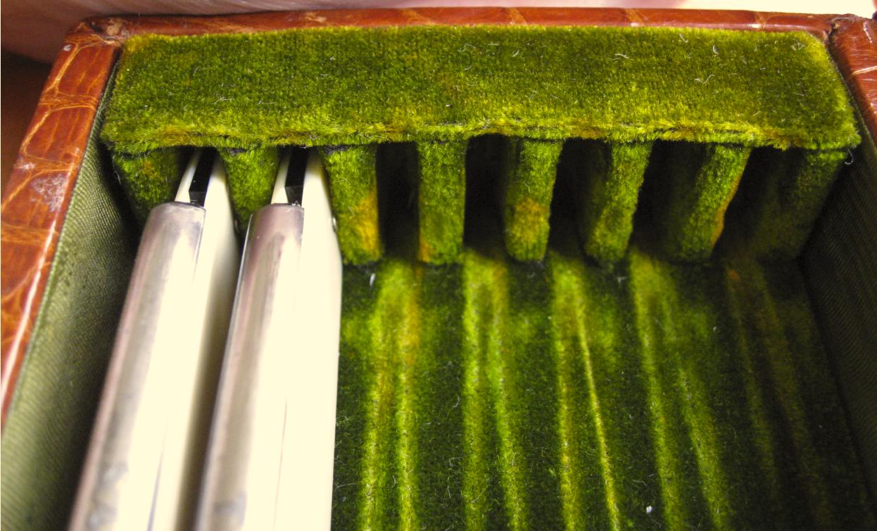 О наборе: Футляр - кожа (красивая фактура), внутри - бархар и черное дерево. Рукоятки бритв скорее всего ivory. Oдна бритва "понедельник" имеет скол носика, другие - в хорошем состоянии, конечно потемнения имеются, но ржи нет. В эксплуатации были "понедельник" и скорее всего "вторник", другие бритвы скорее всего не использовались. Хранились все время в комоде и никогда не доставались (со слов продавца, а его фамилия по прежнему Rosenlew, узнал, когда платил деньги (на аукционе у него ник) ).