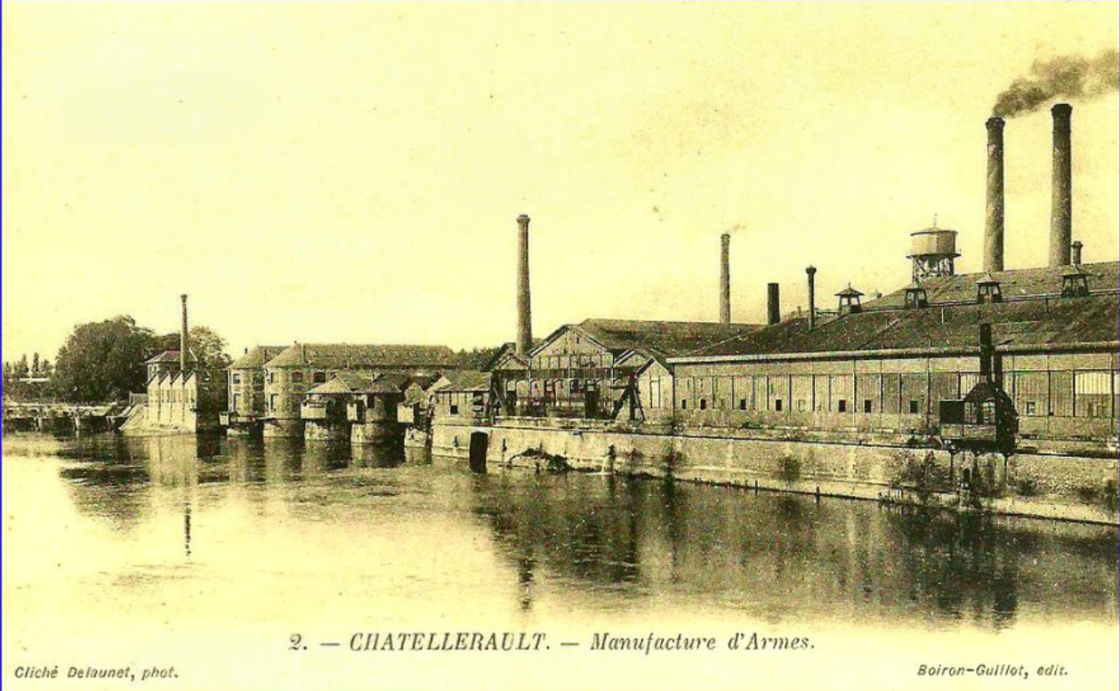 Но что, несомненно, внесет решающий вклад в упадок ремесленной деятельности, так это создание Мануфактуры оружия в Шательро. После поражения Наполеона I от союзных европейских армий традиционные фабрики, расположенные в основном на Востоке, были сочтены слишком близкими к границам; и было решено закрыть их и создать совершенно новую крупную фабрику к югу от Луары: в конечном итоге выбор пал на Шательро. Благодаря техническому вкладу столовых мастеров с Востока (особенно Клингенталя и Мутцига) уровень качества будет соответствовать уровню, никогда ранее не достигнутому в количественном отношении. А во время Первой мировой войны 14-18 годов там работало более 7000 рабочих; что делает его самым важным заводом в Европе. Первоначально производя клинковое оружие (и особенно сабли, подобные его эльзасским аналогам), с 1830 года оно обратилось к огнестрельному оружию.