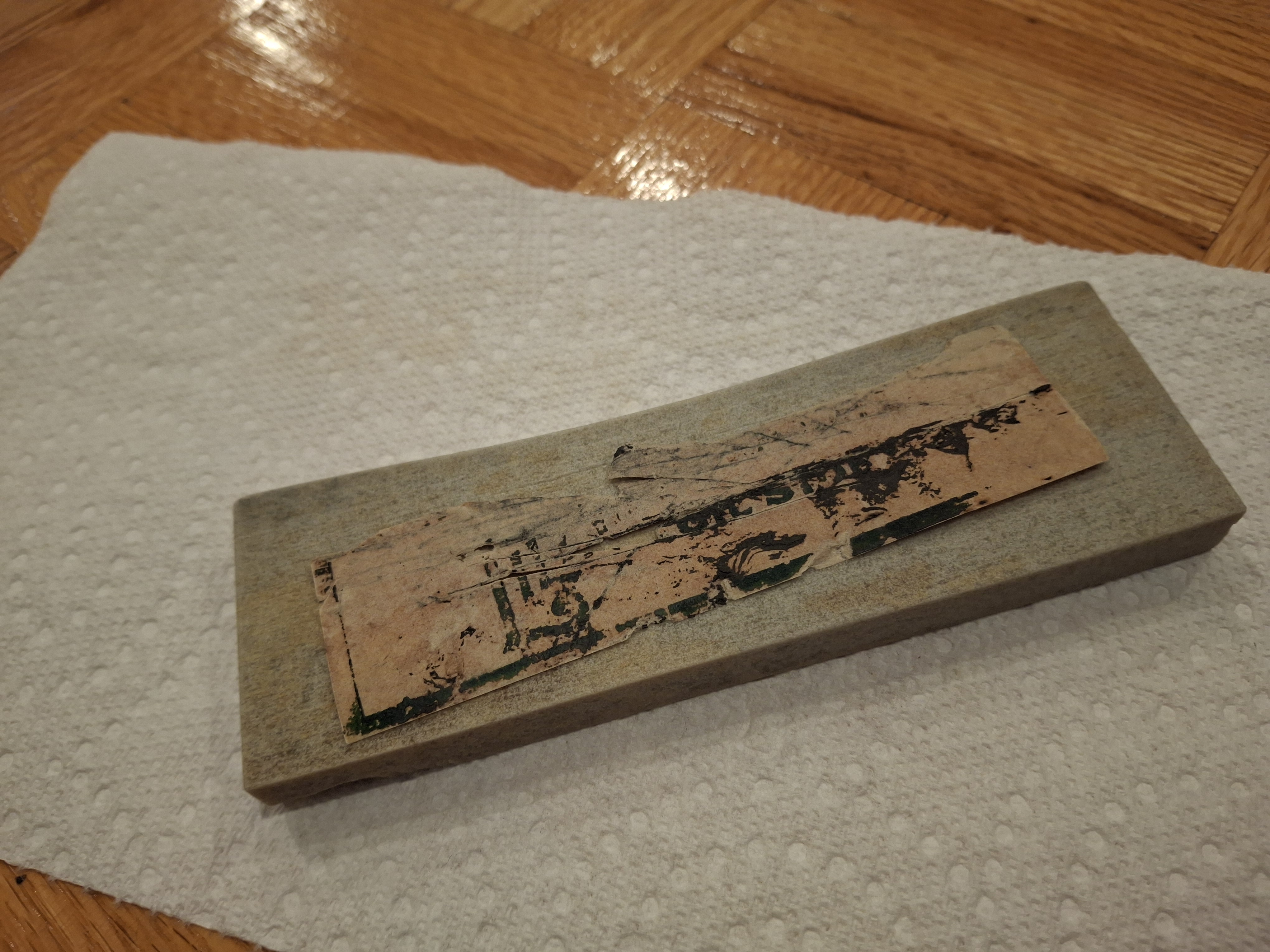 А это из последнего набега. Попорядку- там о шантер 8 дюймовый(не выдержал выколупал из короба в машине) был замаслен так, что понять что это было нереально. Второй- оказался карборундум, но очень тонкий. Третий, когда отмылся, оказался хиндостаном. Четвертый- вашита от смитов. Сейчас смиты такие камни называют хард Арканзас. Есть с чем сравнить. И последний, который в коробе ребром стоял- Лили вайт вашита с остатками родной этикетки.