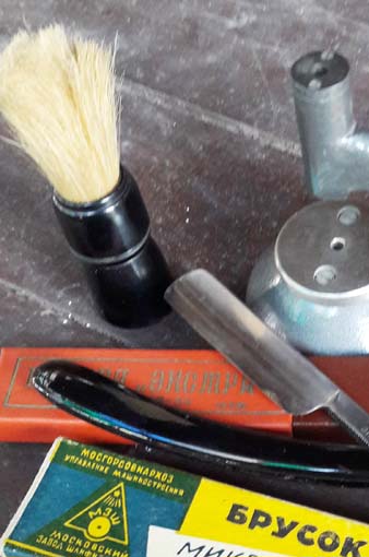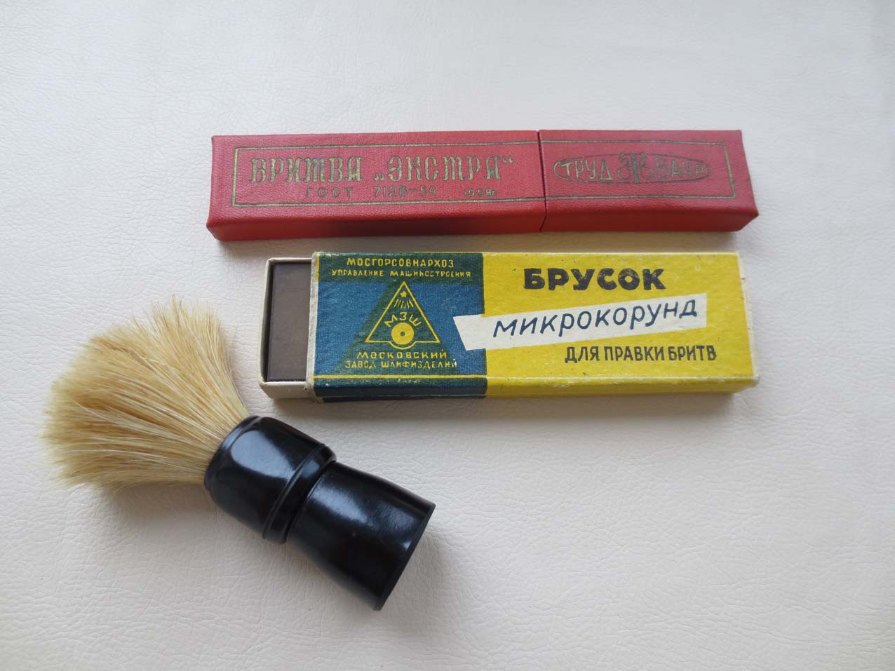 Непользованная "Экстра" 58 со следами заводского масла, камешек "Микрокорунд" и новый помазок... Красота! Помазок очень понравился - ФТЩ им. Калинина. Думаю, что это аббревиатура от Фабрика Технической Щетины, а там кто её знает. В инете нашёл только - Кистевязальная щеточная фабрика им Калинина Деткомиссии при ВЦИК Москва Таганская 36.Ну и название... Помазок поначалу был снулый( на первом фото), в кипяток его , потом шампунь и он приобрёл первоначальную форму. Легкий запах карболита, как от "лампы НКВД". Вылетело пару волосков, когда мыл, остальное дёргал - сидит крепко. Больше полувека помазку, натурпродукт из прошлого, будем тестировать.. Брусок "Микрокорунд" Инструкция к нему..) Бесит, когда приходится пользоваться бритвой моложе себя...