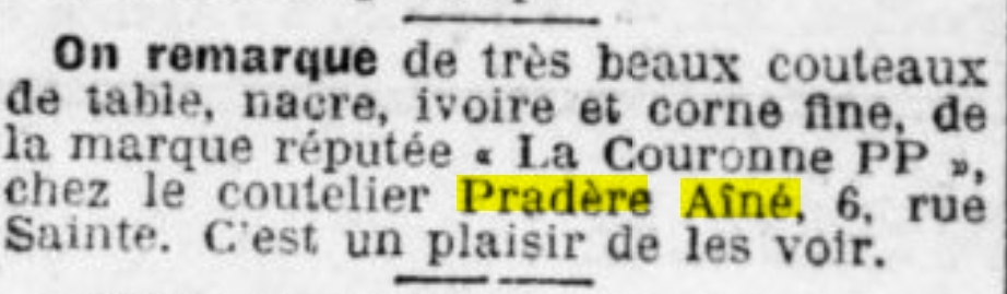 Первая реклама этого магазина (или бизнеса ножовщика PRADÈRE AÎNÉ) встретилась в газете
