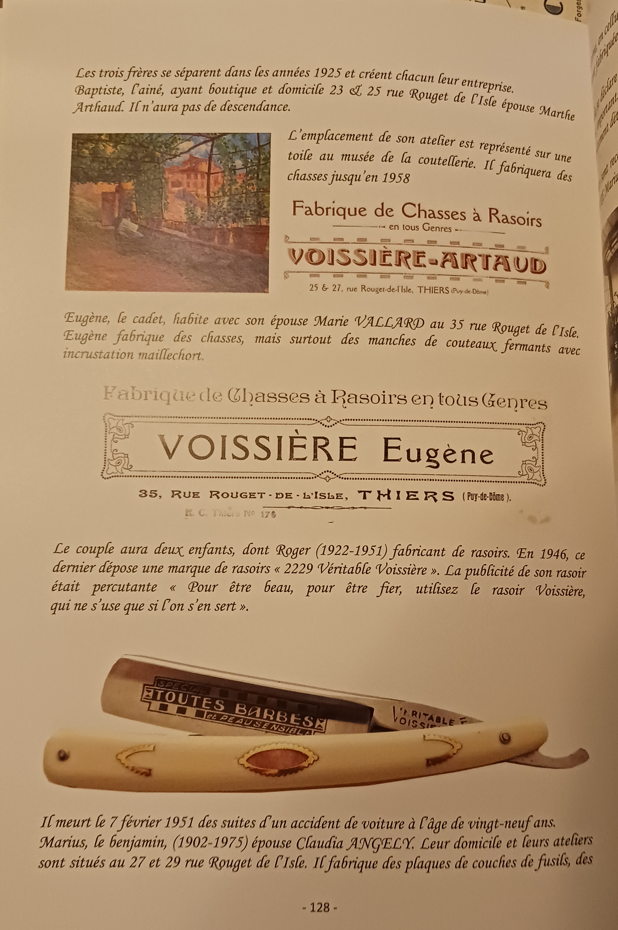 Авторы: Алекс Делэд Андре Моран Никакой мужчина не может быть по настоящему счастлив пока не постигнет умения хорошо выбриться. Жан Вуассьер (1754 - 1834) первый мастер ножевого дела женился с Жениз Буш. Семь детей родятся от этой четы, и Жильбер, рожденный в 1794, ножевик, проживал на улице Pave (Сейчас улица Rouget de l'Isle). Берет в жены Анну Лаграндж и у них три ребенка, в числе которых Жан (1818-1887), заготовщик роговой оправы на улице Pave (Подготавливал и преобразовывал рог для использования ручек и оправ) Жан берет в жены Мари Дюриф. От брака родятся дву ребенка. Мари, рожденная в 1850 выйдет замуж за Жака Прадель (Pradel), кузнеца в Мутье. Антуар, рожденный в 1853, заготовщик рога. 1 января 1879 года Жан Вуассьер (Voissiere) заинтересовал своего сына Антуана своим делом и коммерцией. И вот сын женится в 1885 с Мари Бешон, с кузнецом Chaylas (Saint-Remy-sur-Durolle). 7 июля 1886 Жан и Антуан образовали общество по использованию и продаже оправ из рога для кованных изделий под маркой "Voissiere Отец и сыновья" с офисом по адресу улица Pave 31. Справочник товаров и продаж возник в этот день. В нем указано 6065 кг необработанного рога : коровий, буйвола, быка, бразильский рог (рог коровы с рисунком и розовым оттенком) (Далее перечислены другие товары обработки рога ..., пресс для рога и прочее) 31 марта 1887 года, Жан Вуассьер, заболевает и покидает общество и делит свою часть общества между своими двумя детьми. Он умер 2 июня 1887. В 1888 Мари Вуассьер выходит замуж за Жака Pradel и продает брату Антуану часть общества от наследства их отца. Антуан ведет дело фабрики до самой смерти в 1916. Три ребенка родились от брака Антуара и Мари. Жан-Батист, рожденный 25 ноября 1886 года. Эжен Бнне, 14 августа 1890 года. Мариус 6 апреля 1902 года. В 1918, после смерти их отца, три брата Вуассьер присоединяются к производству и выпускают две марки бритв: "Красный крест" и "Санитар". Бритвы с оправой из рога буйвола будут устанавливаться на бритвы этой эпохи. Братья расходятся в 1925 году и каждый создает свое отдельное общество. Батист, старший сын, уже обладает магазином и домом с номером 23 и 25 на улице Rouget de L'Isle берет в жены Марту Arthaud. У них не будет потомства. Расположение его ателье представлено звездой в музее ножевого дела. Он будет производить оправы до 1958 года. Фабрика Voissiere-Artaud. Эжен, младше, живет с женой Мари Vallard рядом по адресу 35 Roget de L'Isle. Эжен изготавливает оправы, но особенно ручки складных ножей с инкрустацией из металла. Фабрика Voissiere Eugene. У этой пары два ребенка родятся: Roget (1922 1951) создатель бритв. В 1946 он выпускает марку бритв "2229 Veritable Voissiere". Рекламный лозунг его бритвы был очень эффектным: "Чтобы быть красивым и гордым, используйте бритву Вуассьер, которая используется, пока ей пользуются" (Игра слов и звуков, благоприятных на французском языке). Он умирает 7 февраля 1951 года в результате автомобильного происшествия в возрасте двадцати девяти лет. Мариус, младший, женится на Клавдии Angely. Их дом и мастерская находятся по адресу 27 и 29 на улице Rouget de L'Isle. Он изготавливает многослойные пластины для ружей.
