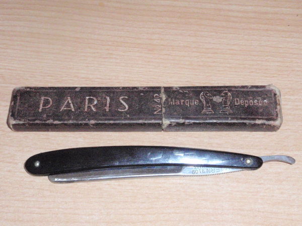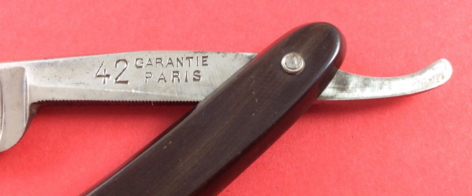This 1920s French manufactured straight razor has the shank stamped on both sides. The face side has "42 Garantie Paris" and the reverse has "Made in France" along with a model number set in an oval cartouche "HB520". This relates to the 42 Honeless razor model produced by P. F. Ferrier of Paris. 42 Garantie Paris Show Re: 42 Garantie Paris, HB520тот продавец ошибся.
