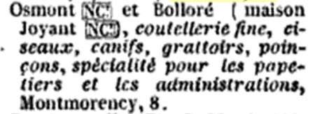 OSMONT родился в Sainte-Geneviève-les-Gasny (Eure) в 1823 году, агент по продажам столовых приборов (ножей). Фирма "Osmont et Bollore", Париж, улица Montmorency, 8.