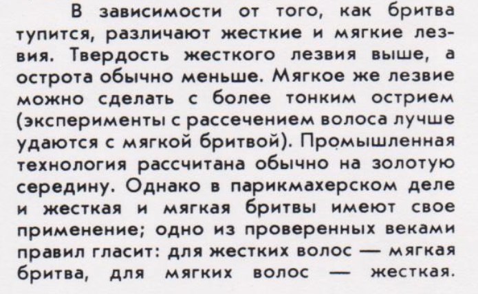 А княжеский дар им не нужен; Правдив и свободен их вещий язык И с волей небесною дружен. А. С. Пушкин. Песнь о вещем Олеге. Бритва для ООчень жесткой щетины!Нету обоснованного ответа. Для боле-менее точного ответа надо: 1. Иметь одни и теже камни на протяжении многих лет 2. Иметь одинаковую методику заточки, и эта методика должна быть измеряемой величиной. Например: на камне А - 40 кругов, потом на камне В - 60 кругов. Посмотрел в микроскоп или провел тест на волос - мало. В конце заточки все значения записать в тетрадь. 3. Переточить по одинаковой методике минимум 100 бритв каждого образца, бритв Москва 40х годов 100 штук, 50х годов 100 штук, Экстр до 55 года 100 штук, с 55 (гост) до 60 года 100 штук, Особых также, Вачу.... и т.д. 4. Сравнить записи. Вот, теперь можно делать выводы. А точить "по памяти" это не чистый эксперимент. Тут Спорт точил на фоне мягких шведок, там Экстру заточил вместе с японками, круги не считал, а в памяти остались ложные ощущения. Да, я интересовался - есть ощущения у тех, кто много точит, что Экстра потвёрже. Это подтверждают и некоторые источники, например одна известная статья из журнала Химия и Жизнь, автор Герчиков: И по теме жестких волос, из той же статьи: "Для жестких волос - мягкая бритва, для мягких волос - жесткая бритва" Кто не читал полностью эту статью, могу куда-нибудь выложить. Выводы в статье, может и спорные, но с ними (выводами) сложно спорить "по ощущениям", нужна методика и статистика. PS статья 1982 года