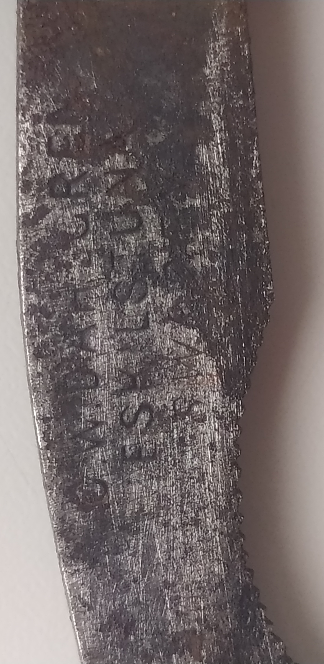 Ручка-черное дерево(предположительно эбен) чем-то пропитано с фабрики, поразительно твердое. Размер полотна ближе к 5/8. Вогнутость-почти клин. Ручная ковка. Период изготовления предположительно 189х-1920