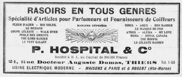 YOUTUBE Олег Бритва INSTAGRAM Олег Бритва Re: Италия? ROMA или что?марку ROMA регистрировали несколько раз, в 1921, 1936 и 1951 годах. Во всех трех случаях марка зарегистрирована на Jean Hospital. Какое отношение он имеет к тому P. Hospital, который LeGrelot пока не ясно, однако в патенте 1921 года написано: Jean Hospital fabricant de rasoir, хотя на рекламе 1937 года ROMA присутствует в списке торговых марок у P. Hospital, который LeGrelot