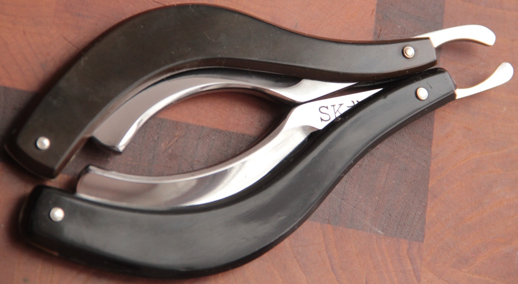 Конечно, меня интересовали в первую очередь только две модели:SK-1 и SK-2. SK-3 тоже прекрасна, но бритв подобной формы достаточно много и для меня она была не интересна в плане новых впечатлений. Внешний вид: Все три бритвы этой серии смотрятся необыкновенно и оригинально. Сказать, что бритвы красивы, это ничего не сказать. Они красивы, породисты. Чувствуется большой труд человека, вложившего в создание сего шедевра свою душу и всё свое умение. Как я понимаю, сталь на бритвах была шведская.Другой не видел.У меня их много уже было и в каком бы состоянии не находились бритвы., после небольшой чистки полотна, сталь опять приходила к своему первоначальному виду. Очень качественная сталь Особое внимание хотел отметить на идеальную геометрию изготовления.При такой, на мой взгляд, сложной форме при изготовлении полотна, кромочка всегда, на всех моих бритвах, была идеально ровненькая и еле заметная. Честно говоря, уточенных бритв не видел. Или люди действительно очень аккуратно ими пользовались, или просто их настолько мало, что не удалось увидеть бритвы в более неприглядном виде. Также красиво смотрится "ступенька" или ребро жёсткости на лезвии. Переход от выработки металла шлифовальными кругами разного диаметра.Ручка сделана из обычного пластика, часто используемом на всех японских бритвах. Сборка тоже качественная, без особых изъянов. Да, забыл сказать, что SK-1 отличается от SK-2 только размерами. При одинаковой форме 2 крупнее 1. Заточка. Тут, конечно, придётся повозиться. Не то, что точить трудно такую бритву(Что пишут многие на СРП), скорее эти бритвы не любят суету и спешку. За счёт своей формы лезвия, кромка бритвы не ложится всей длиной на поверхность камня и пятно контакта обрабатываемой поверхности совсем мизерное, что заставляет довольно долго и нужно обрабатывать каждый миллиметр. Особенно долгим кажется процесс, если использовать японский натурал с нагурами. Честно говоря, вначале меня сильно напрягло такое количество понраченного времени и сил. Но, с каждым разом, когда ко мне в руки попадала очередная сабля, я стал получать ни с чем не сравнимое удовольствие. Когда точишь , а затем доводишь долго и тщательно одну такую бритву, ты как бы медитируешь с ней и постепенно заряжаешься некой энергетикой. И , если не спешить с заточкой, то бритва реально отплатит в будущем комфортным и мягким бритьём. Теперь о бритье. Сначала бритва не оправдала моих ожиданий в плане бритья. Я думал, что за такие деньги, что она стоит, она должна сама брить тебя везде очень качественно и чисто. Но, немного не угадал. Первые попытки побриться комфортно ни к чему не привели. Вернее привели., но бритьё показалось несколько жёстким, хотя и без раздражения. К тому же, по неопытности, бритвой с таким изгибом лезвия бриться просто реально неудобно. Бритвы вынуждает тебя действовать косым резом, что не всем подходит и не все пользуются этим способом . Есть шанс порезаться. К тому же, количество сбриваемой щетины не слишком велико при одном проходе, опять таки, из за особенности лезвия. И, техника бритья , которой привыкли бриться, используя бритву с прямой кромкой,тут не подойдёт. Придётся, всё таки, несколько доворачивать бритву при бритье, тем самым получая косой рез. Но, со временем, поняв свои ошибки при заточке и тонкой доводке и сделав выводы из первых опытов бритья, с к