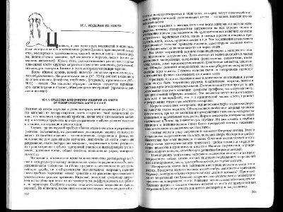 Печать по книге "Производственная техно-химическая рецептура", Москва 1931г. . КОСТЬ и РОГ. I. Беление кости. 1. Беление кости. Чтобы сообщить пожелтевшей слоновой кости первоначальную белезину, практикуют один из следующих способов: а) Слоновая кость слегка покрывается тонким слоем скипидара и выставляется дня на 3 или 4 на солнце, б) Взбалтыванием перекиси водорода с эфиром или бензином приготовляют эфирный раствор перекиси водорода. Отделяют через делительную воронку и обрабатывают этим раствором перекиси водорода, содержащим приблизит. 50 (по объему) кислорода, кость или рог. Этим способом одновременно растворяется жир и подвергается белению кость. Однако этот способ очень дорогой, в) Сначала кости обезжиривают обработкой эфиром или бензином и затем кладут в водный раствор фтористой кислоты, содержащей 1 % безводной кислоты, г) Обработанные предварительно бензином или эфиром кости кладутся в теплое место; когда последние следы жирорастворителя исчезли, кладут кости в смесь равных объемов перекиси водорода и воды и держат в ней до тех пор, пока они не выбелятся. Затем их моют в чистой воде и сушат, д) Слоновую кость погружают на некоторое время в перекись водорода, после чего ее насухо вытирают. Чтобы ускорить процесс беления кости подвергают ее действию лучей синей кварцевой электрической лампочки (что употребляется для лечебных целей). 2. Отбелка пожелтевших клавишей музыкальных инструментов. а) Клавиши обмывают раствором соды и затем покрывают растертой с водой в кашицеобразную массу хлорной (белильной) известью, которая должна оставаться на клавишах в течение 8- 12 час. Затем клавиши вытирают мягкой тряпкой. Необходимо тщательно избегать соприкосновения с металлическими частями. б) Клавиши непрерывно смачиваются водой, помещают под стеклянный колпак и подвергают в течение нескольких дней действию солнечных лучей. в) Клавиши кладут в смесь из 1 скипидара и 3 спирта и подвергают действию солнечных лучей. Все эти способы отбелки применимы вообще для пожелтевших изделий из слоновой кости. II. Протравы для кости. Анилиновые протравы для кости. Травление кости анилиновыми красками проще, чем другими способами, так как оно ведется в холодной ванне, чем устраняется возможность растрескивания предметов. Травление производится следующим образом: предметы кладут в таз и наливают столько воды, чтобы они были совершенно покрыты ею. Затем к жидкости прибавляют 2 чайные ложки уксуса и около 1 г краски, причем все равно -растворима ли последняя в спирту или в воде. Для нужных оттенков выбирают подходящие анилиновые краски или составляют их из нескольких. Костяные предметы оставляют в жидкости на 4 - 8 час. и вынимают тотчас же по достижении желаемой густоты тона. Затем их обмывают водой, высушивают и полируют венской известью с мылом. Спиртовые лаки и политуры здесь нельзя употреблять, так как они могут растворить краску на поверхности кости. Если нужно окрасить бильярдный шар из слоновой кости в два цвета, параллельными полосами, то его уже отшлифованным зажимают между тремя тонкими палочками, вставленными вертикально в небольшую дощечку, покрывают среднюю полосу масляным лаком и окрашивают сперва один сегмент, погружая им шар вместе с дощечкой в соответствующую анилиновую протраву. Окончив окраску, дают ей просохнуть, а лак счищают ск