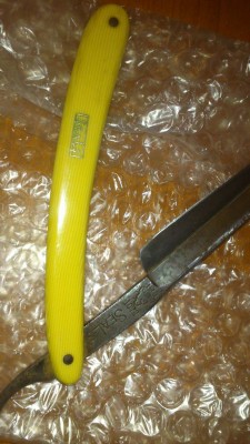 Попались пара бритв Хакамады, но похоже однофамилец.. Продавец уточняет плохоразличимое клеймо на эрле : 袴田芳太郎作 (Hakamada Yoshitarō-saku ) 袴田 (Hakamada) Фамилия 芳太郎 (Yoshitarō)-Имя 作 (saku) - "изготовлена, произведена" Челябинские мужики настолько суровы, что правят бритву не на ремне, а на роже.