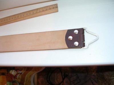Если кожа сильно потерта и смущает владельца, можно обработать воском и заполировать сукном (опция). Намечаем и вырезаем по центру этого изделия выемки (изначально скоба шире)