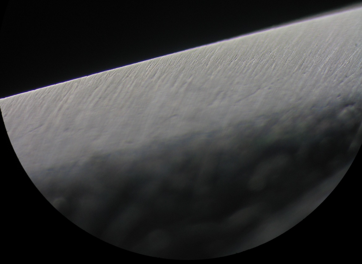 Re: Совместная покупка нагур в ЯпонииКай, вот это уже предметный разговор. Ваш "микроподвод", если закрыть глаза на рваную кромку, безусловно практический гладкий, но после японцев он еще лучше - каверн нет. Как он примерено выглядит см. фото - это после синтетики, похожая картинка и после натур.япона, к сожалению нет под рукой этой бритвы. Заточка не свежая, поэтому успели образоваться небольшие царапины. Но давайте вендетту бельгиец/японец с известным победителем снесем в отдельную тему.