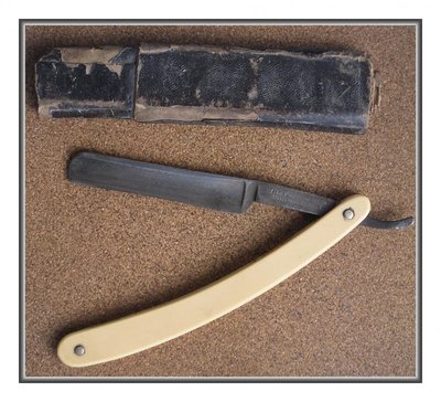 На лезвии, в рамке, гравировка "СОМЕТ". На корпусе:GEO.W.KORN RAZOR MFG.CO LITTLE VALLEY. N.Y.U.S.A. Оправа - целлюлоза (если я правильно определил). Состояние по 10-бальной шкале на 3-ку - 4-ку (лезвие сточено приблизительно на 1-1,5мм плюс "провал" на 1мм по дуге). Размеры самой бритвы не замерял - точного инструмента нет. Продавец писал, что это подарок американского солдата. Какова ценность данного экземпляра (для музея, естественно)? Если, что - пишите в "личку". Опасайтесь людей верующих, ибо есть у них боги, которые им всё прощают.